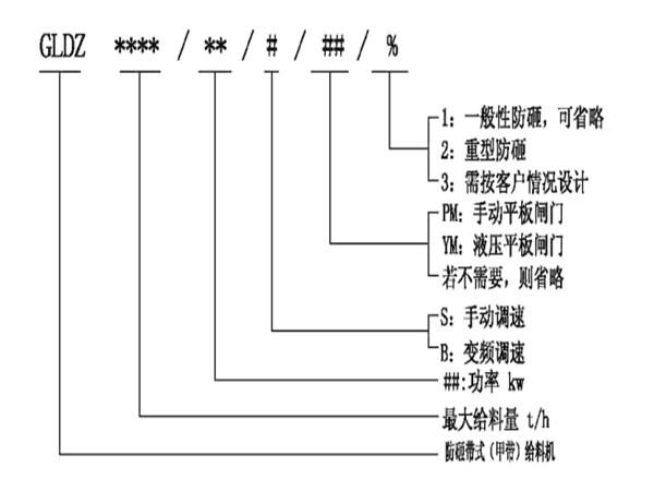 防砸閥門(mén)帶式(甲帶)給料機(jī)型號(hào)說(shuō)明: